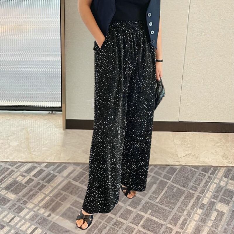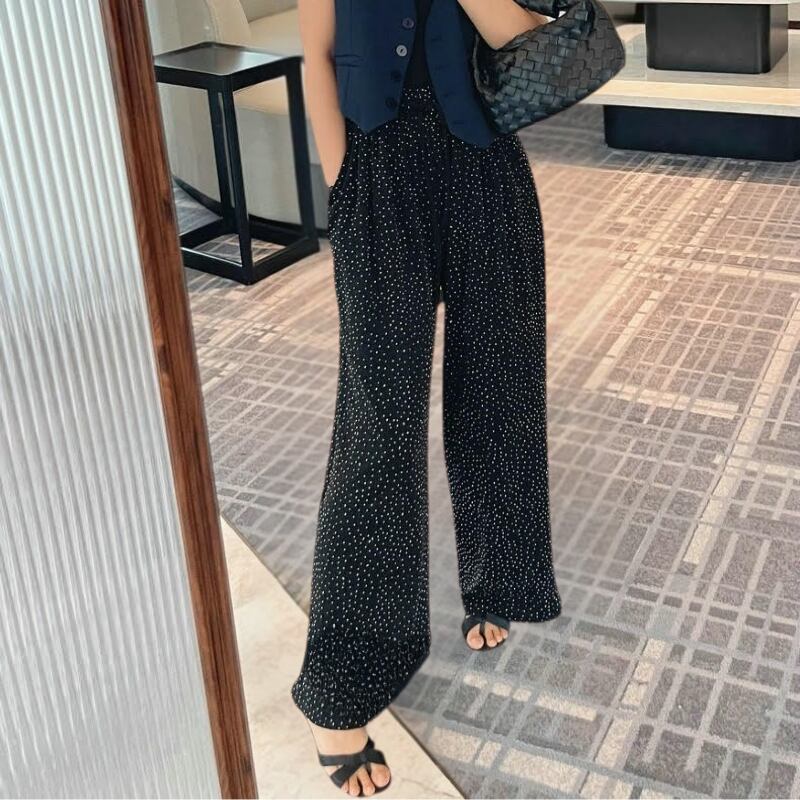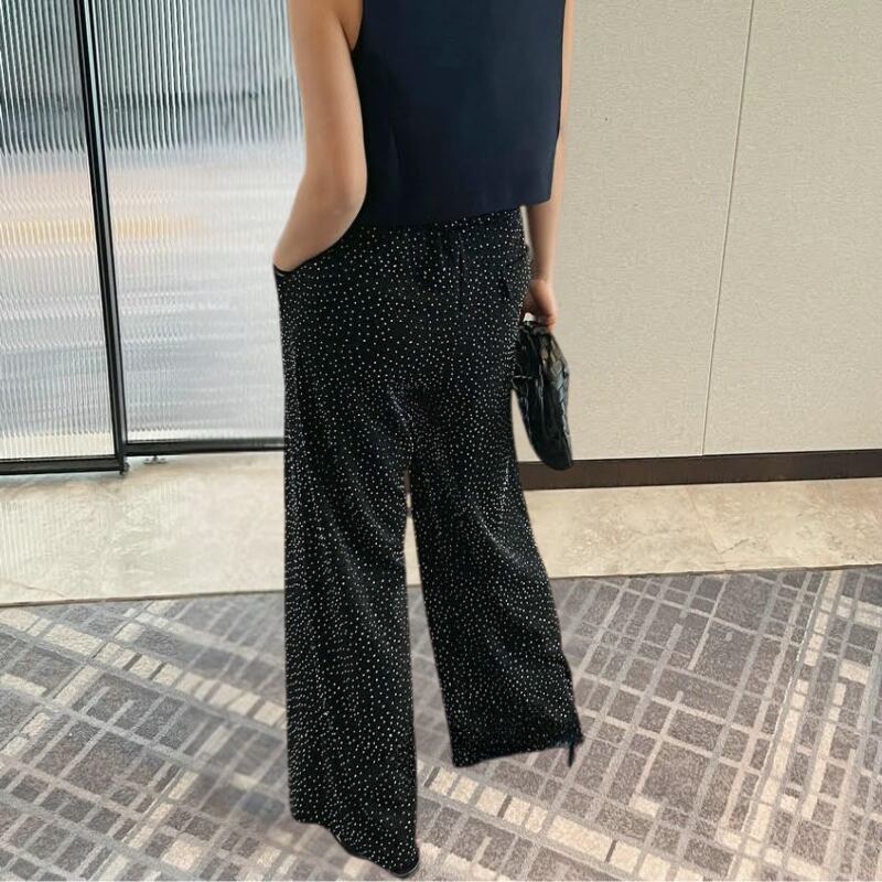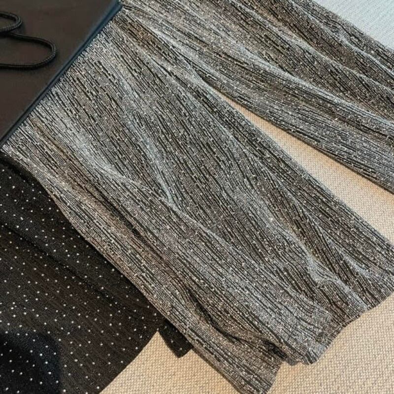 ベーシックなワイドパンツに、ラメグリッター素材で個性を演出。