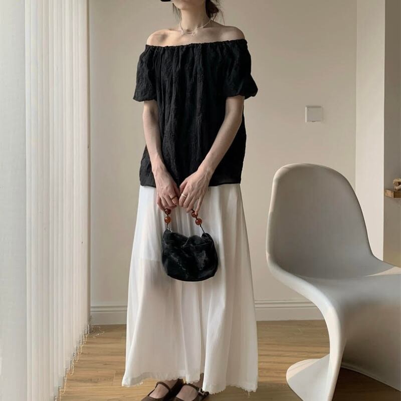 トレンドを押さえたオフショルスタイルは、デコルテを美しく演出し、スタイルアップも叶えます。