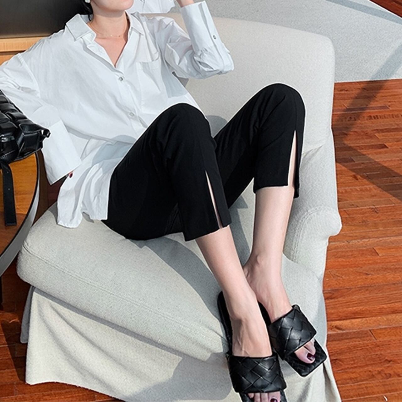 どんなトップスとも合わせやすいシンプルさでありながら、フロントのスリットがトレンド感も演出。