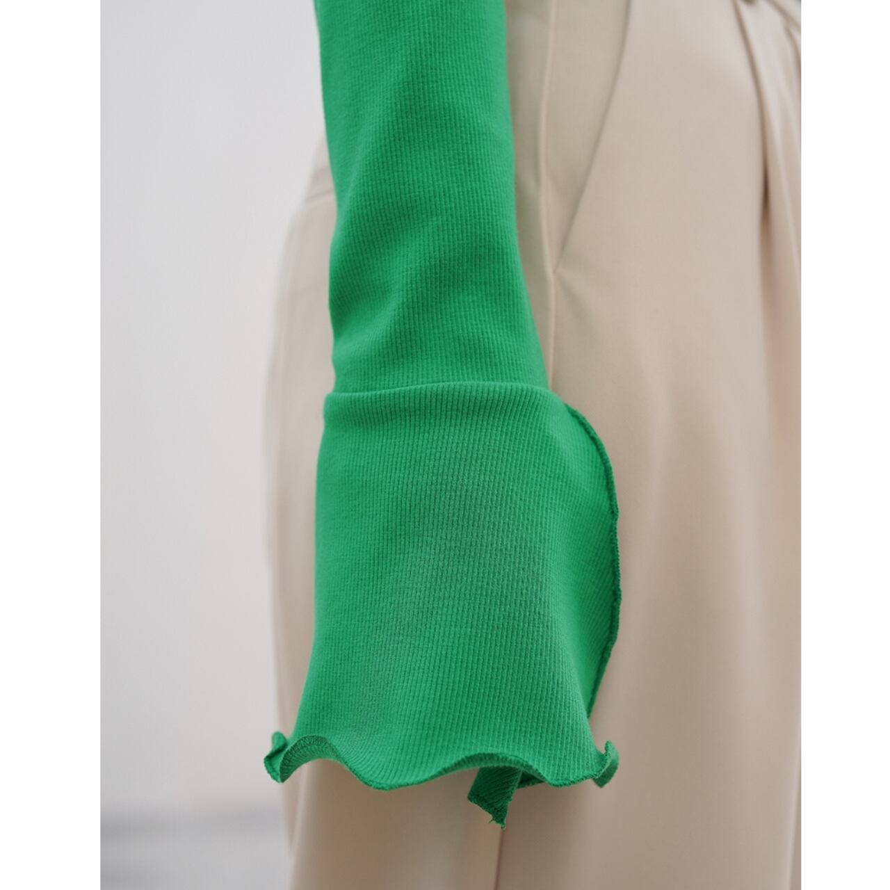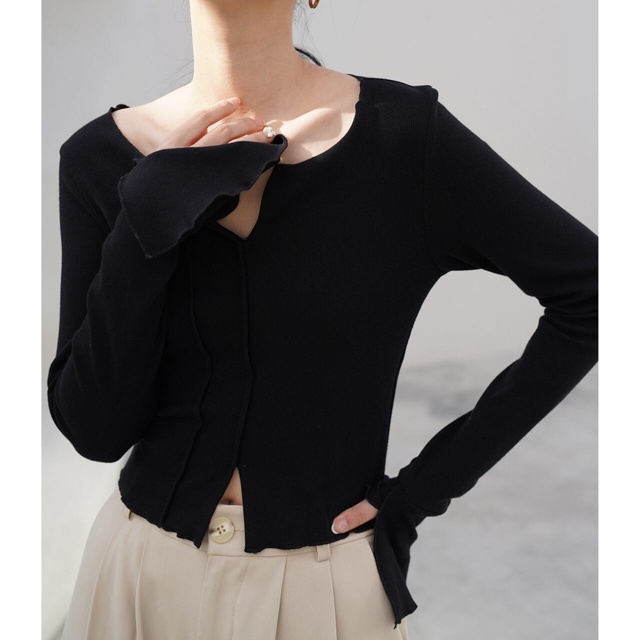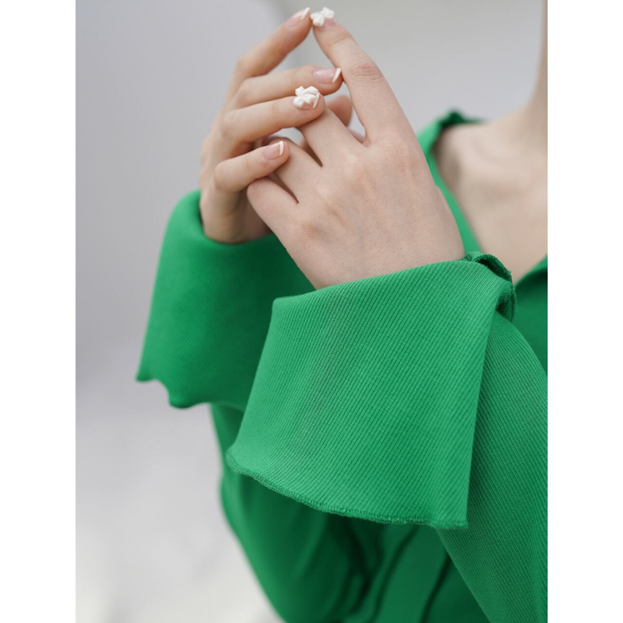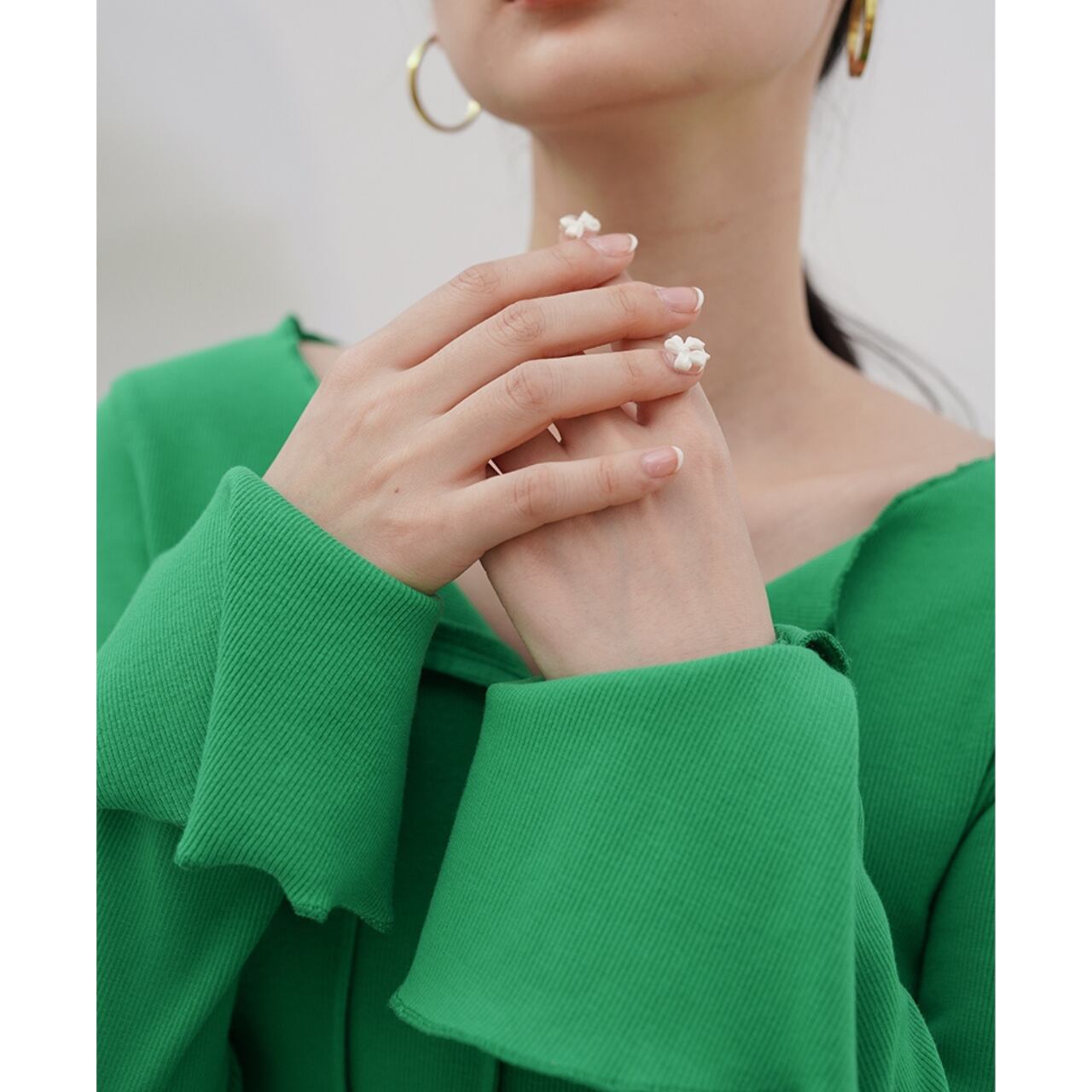 カッティングデザインのネックとフラワーシルエットの手元が、シンプルなカットソーに女性らしいタッチを加え、この一枚でどんなボトムスと合わせてもエレガントな装いに。