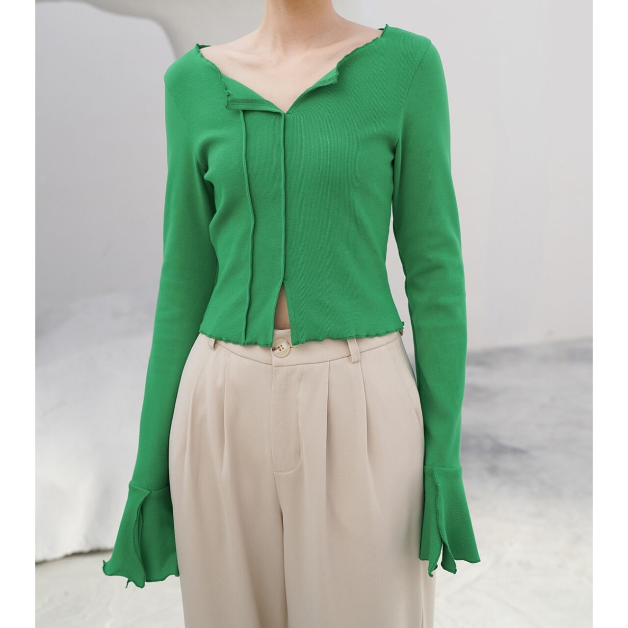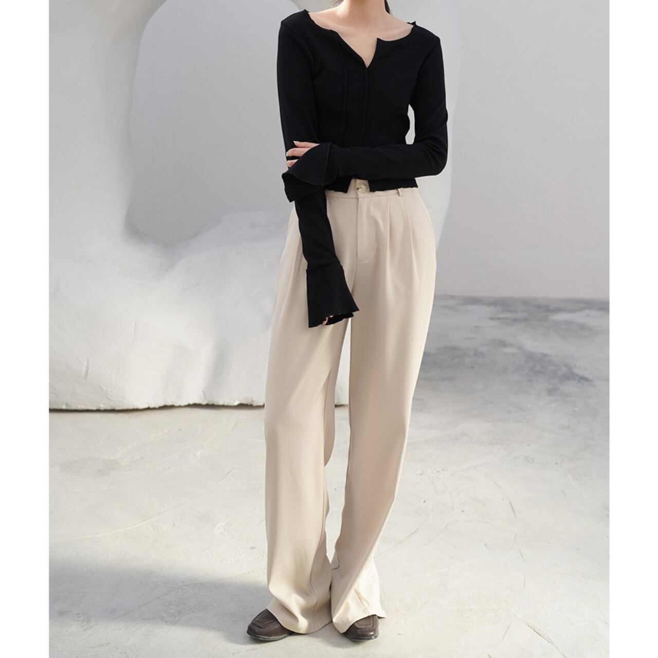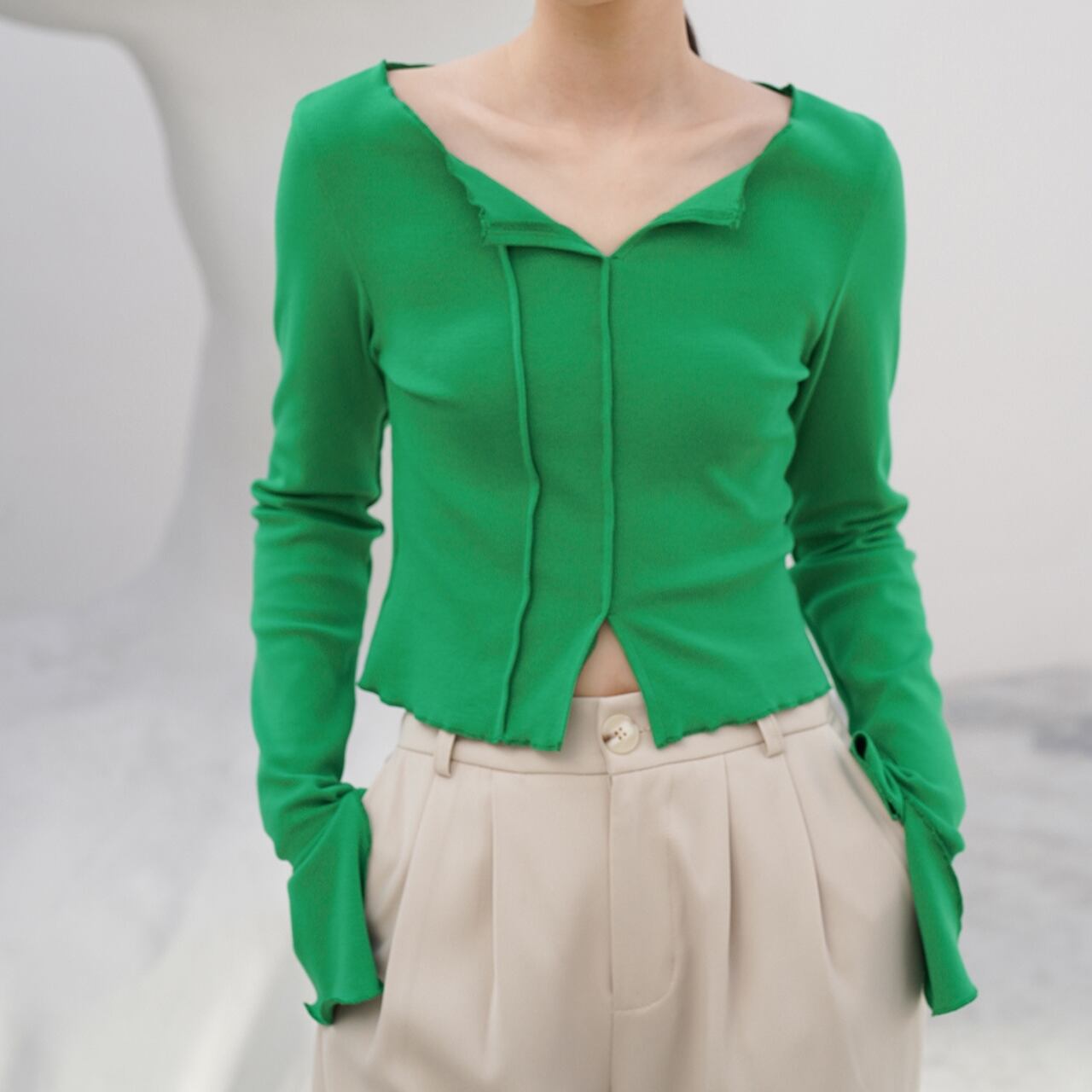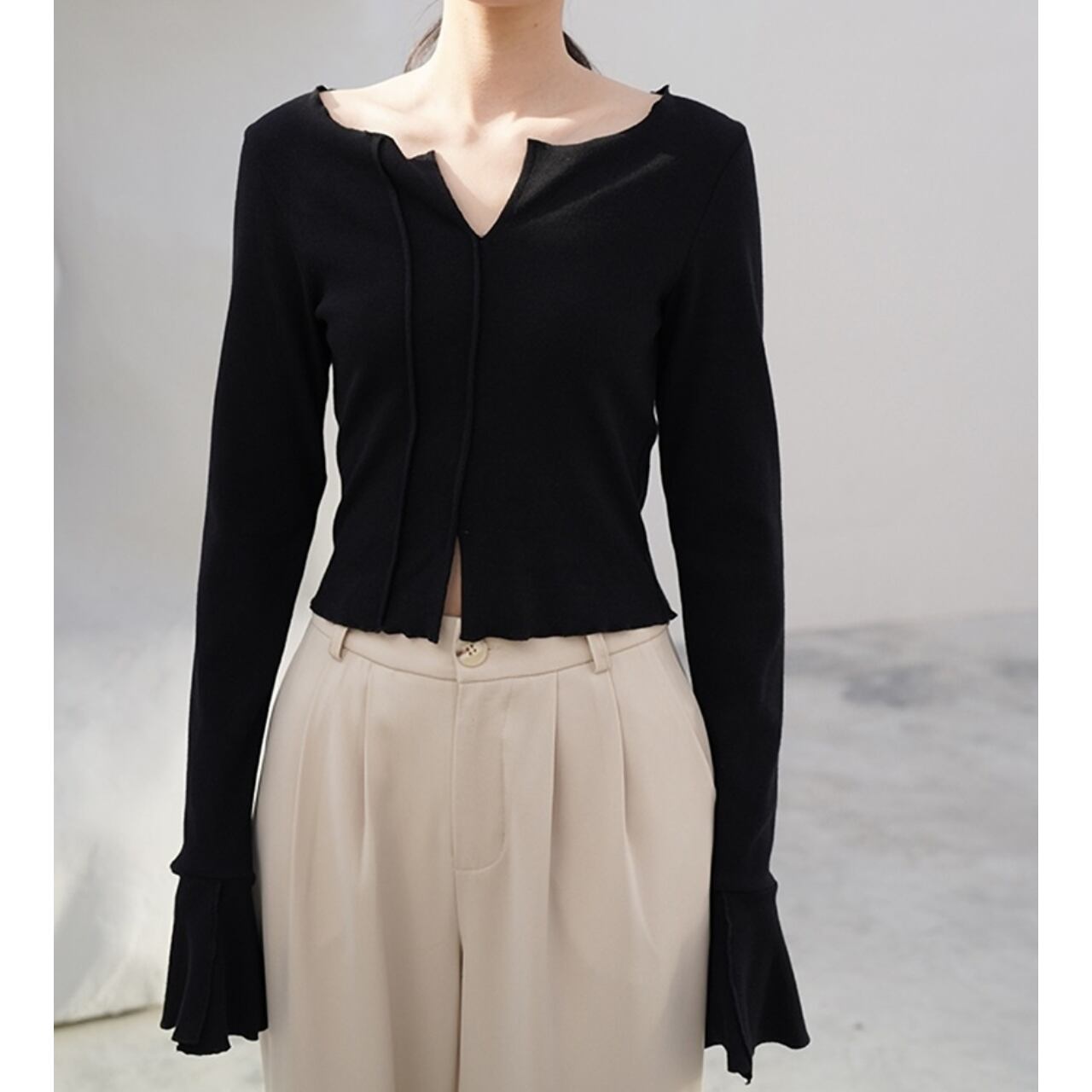 カッティングデザインのネックとフラワーシルエットの手元が、シンプルなカットソーに女性らしいタッチを加え、この一枚でどんなボトムスと合わせてもエレガントな装いに。