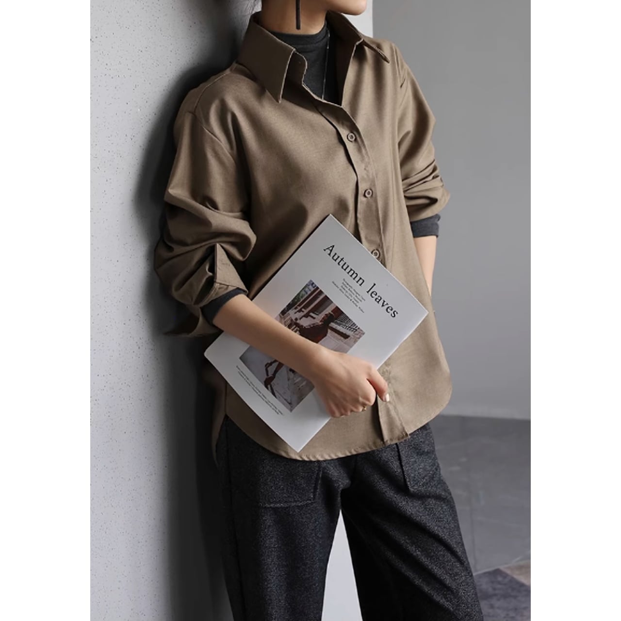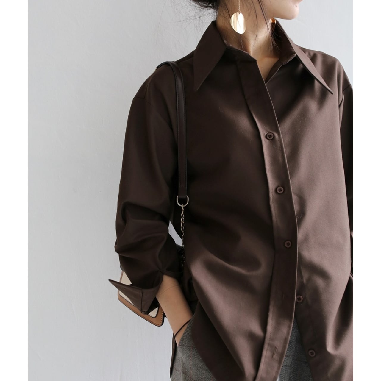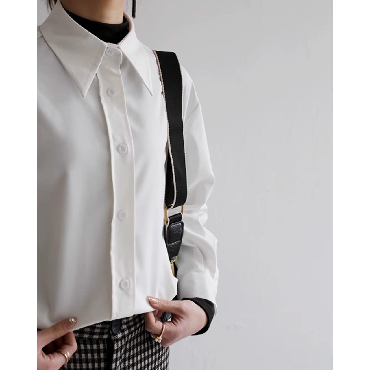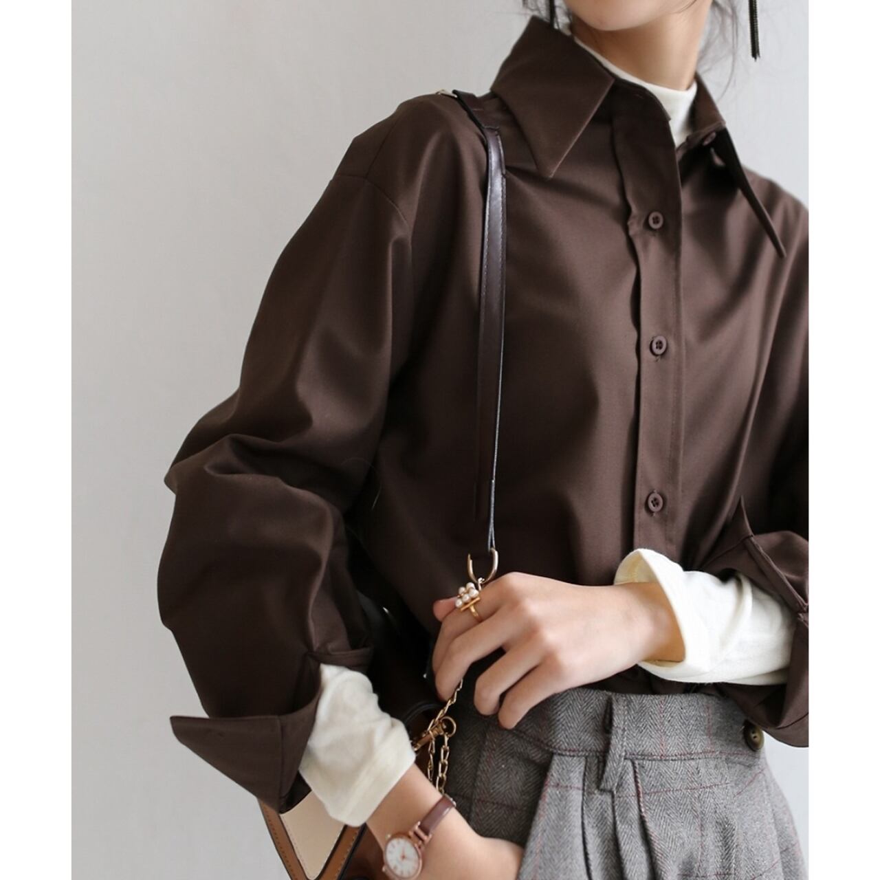 シンプルなシャツながら、長めの襟元がさりげないアクセントとなっており、ビジネスシーンはもちろん、デイリーコーディネートにもおすすめです。