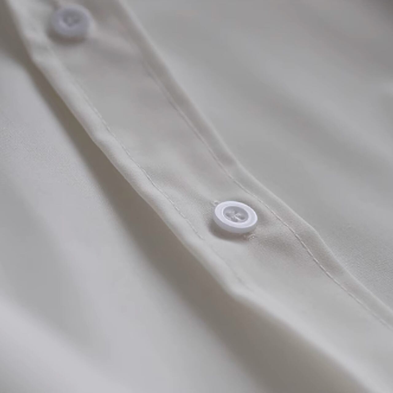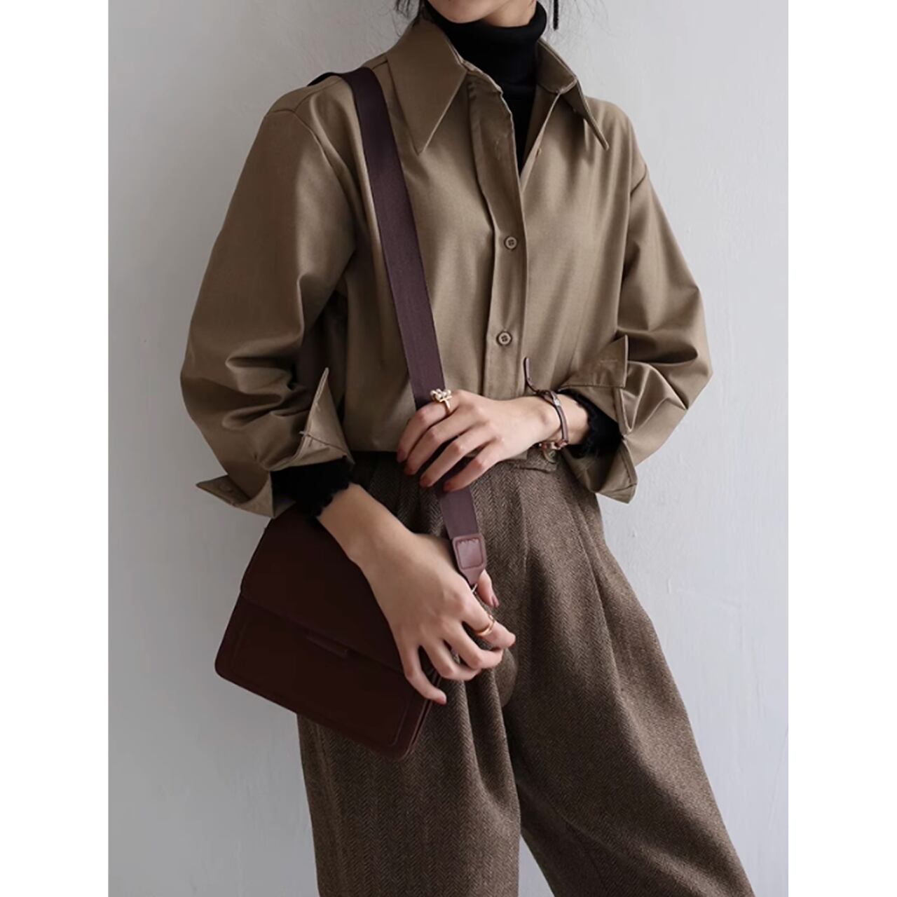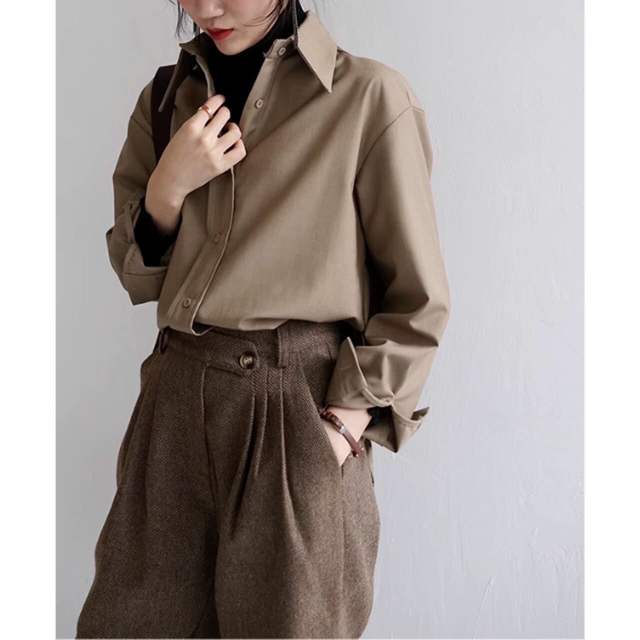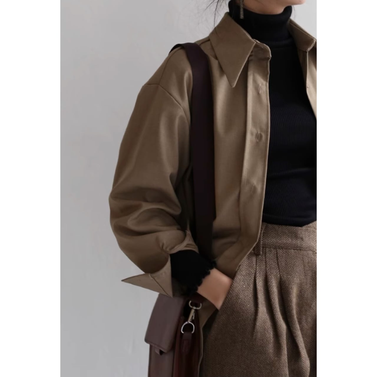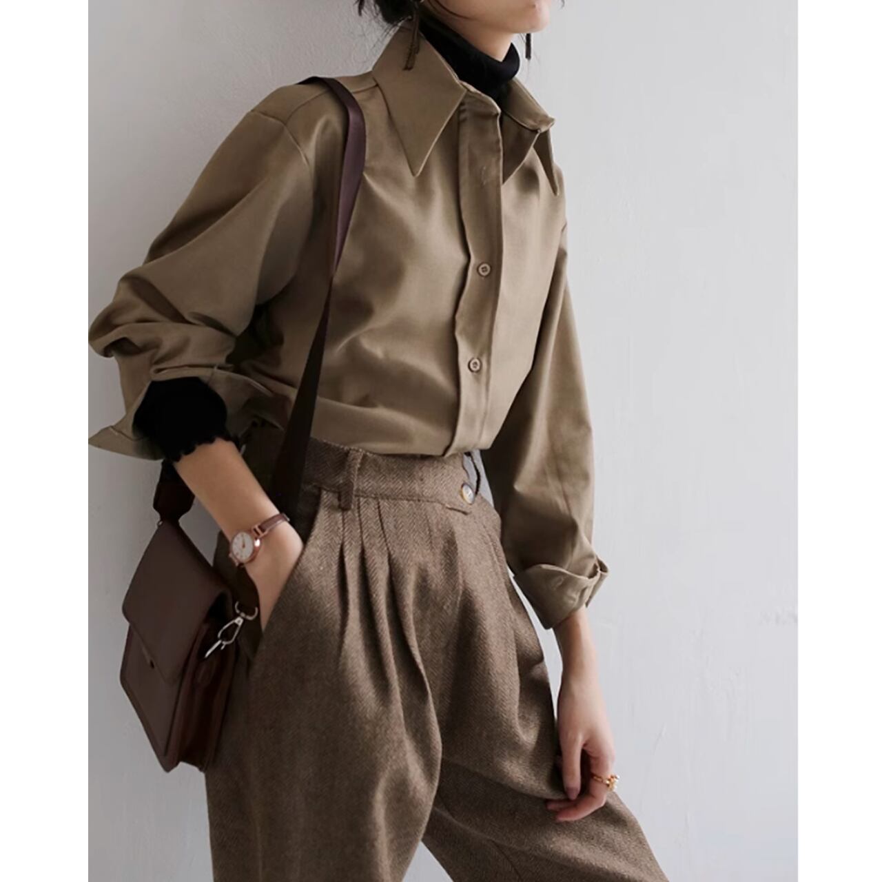 シンプルなシャツながら、長めの襟元がさりげないアクセントとなっており、ビジネスシーンはもちろん、デイリーコーディネートにもおすすめです。