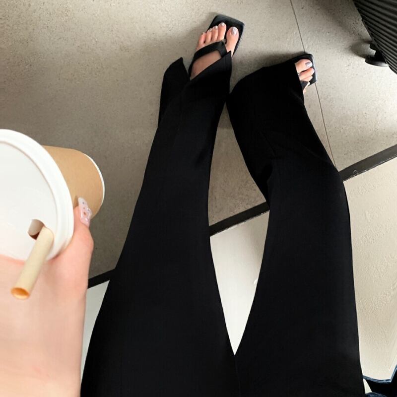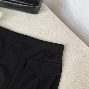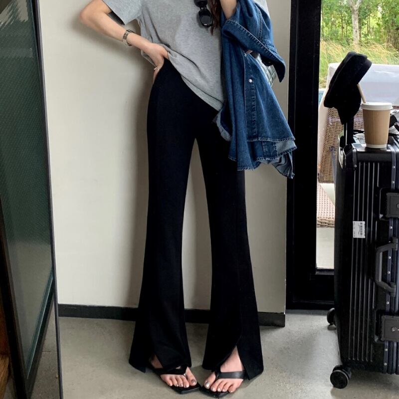 足首から広がるフレアシルエットと、フロントに施されたスリットが、コーディネートをスタイリッシュに。
