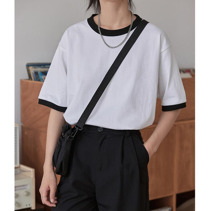 ベーシックなクルーネックTシャツに、アクセントをプラスしたパイピングデザインがポイント。