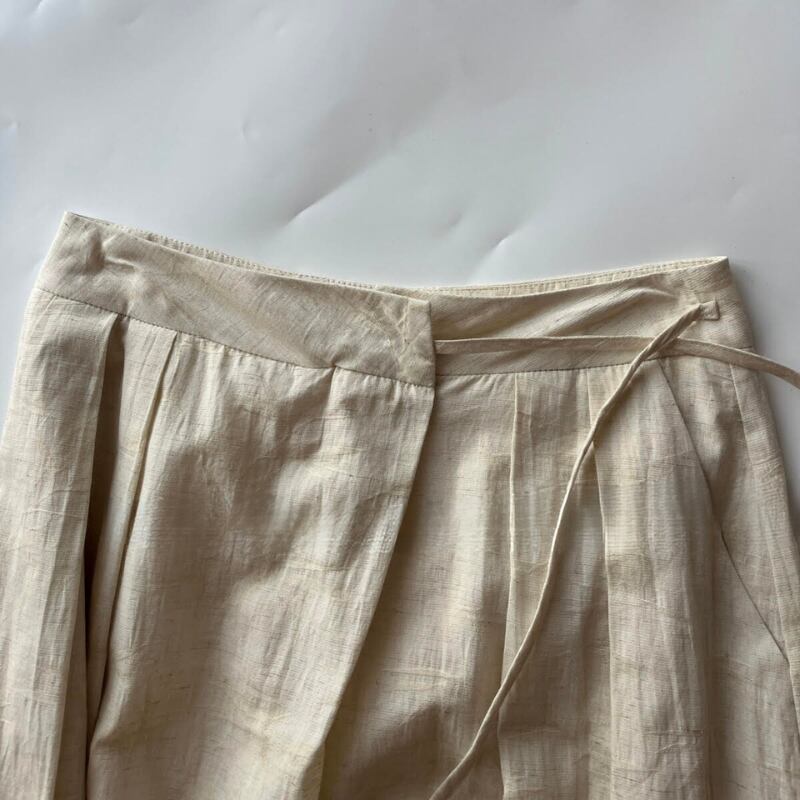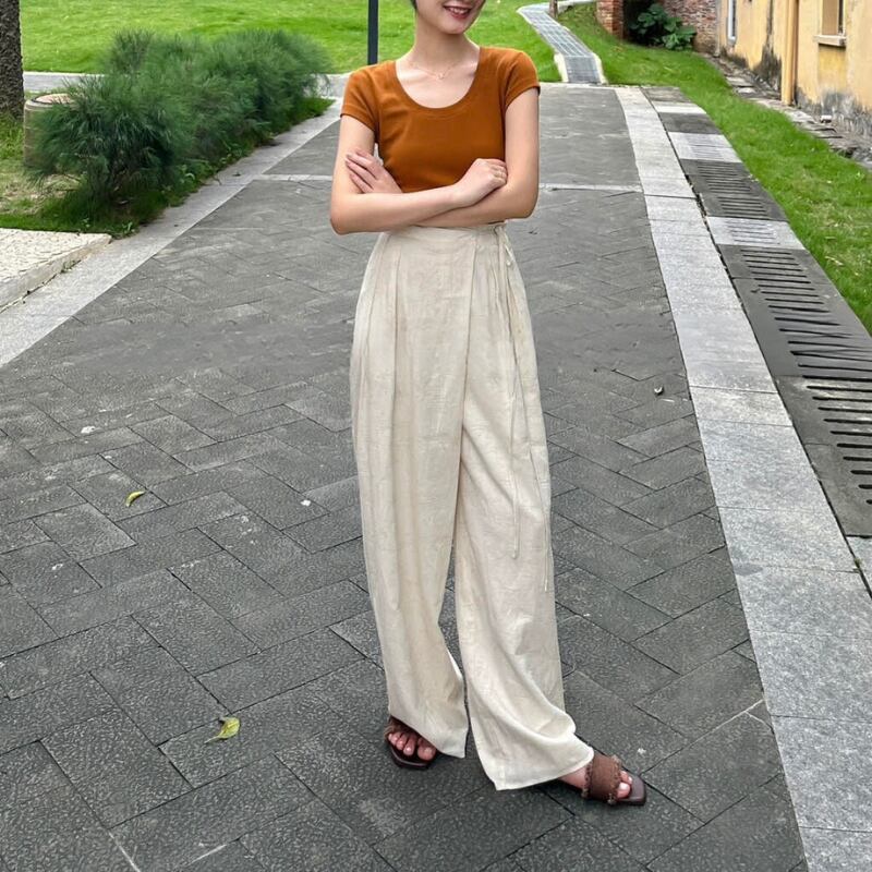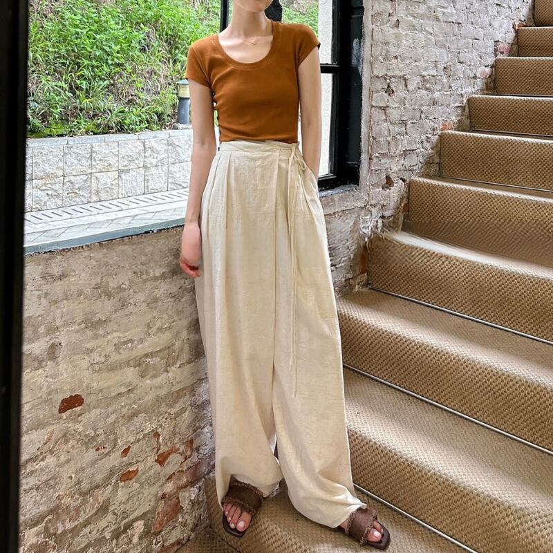ウエスト部分に施されたサイドストリングデザインがポイントで、リラックスしたシルエットとイージータック加工が、カジュアルながらもおしゃれな印象を与えます。