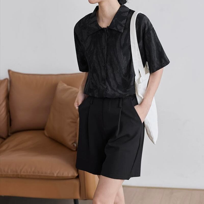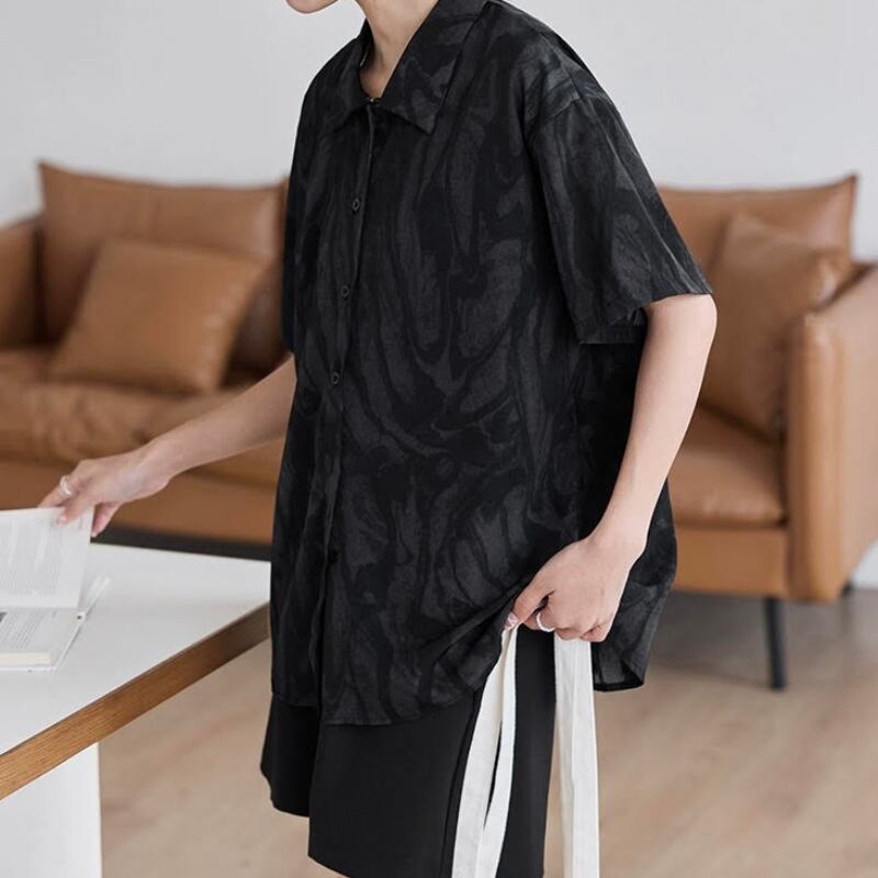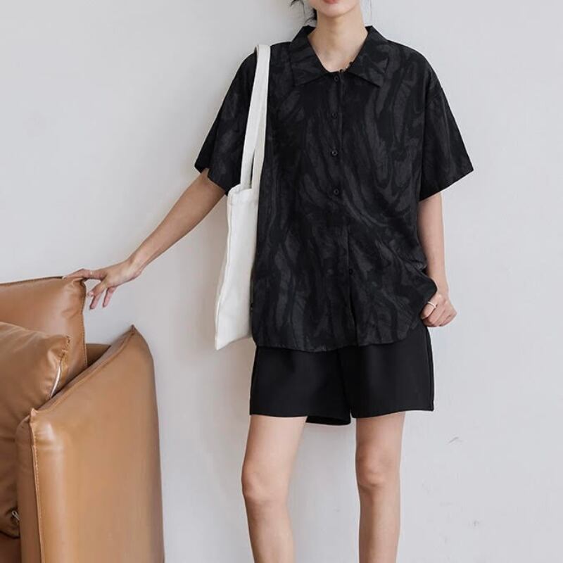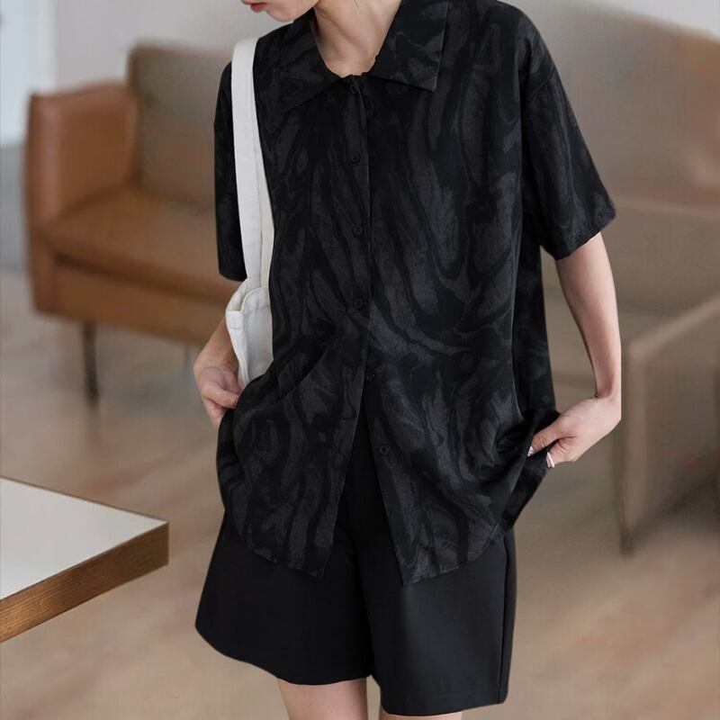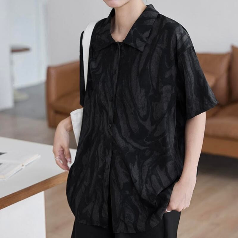 大胆なプリントとシックなカラーリングが目を引く一枚で、スタイリッシュな着こなしを演出します。