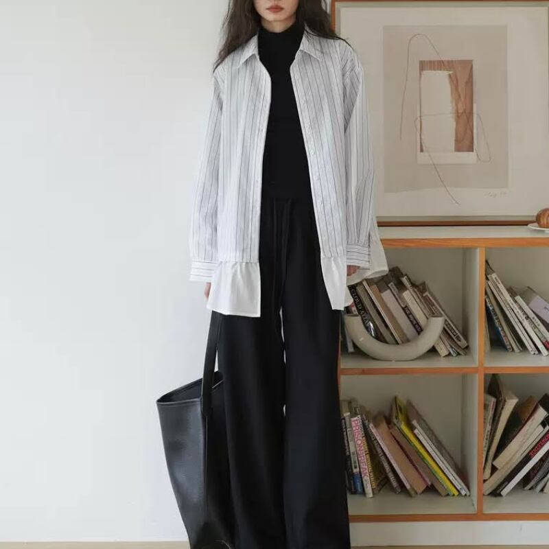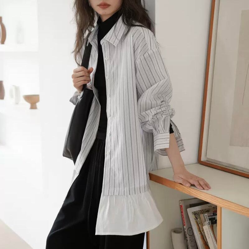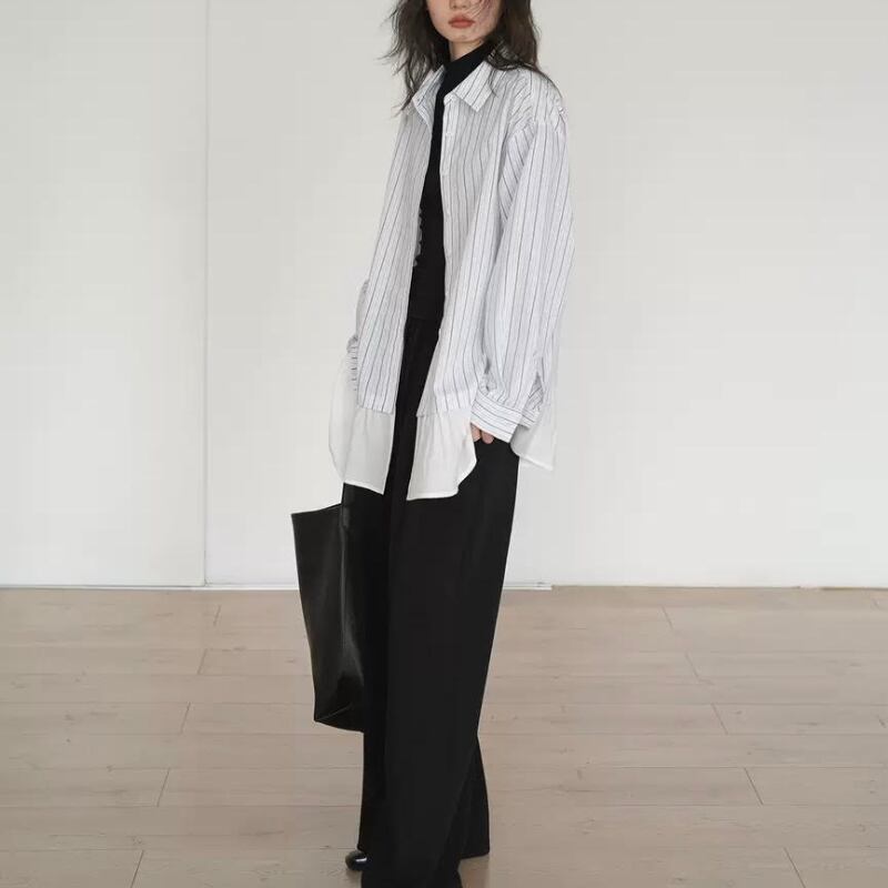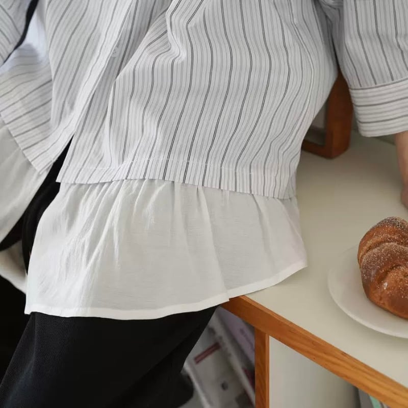 シンプルで清潔感のあるストライプ柄が上品さを演出し、フリルヘムが女性らしいアクセントに。
